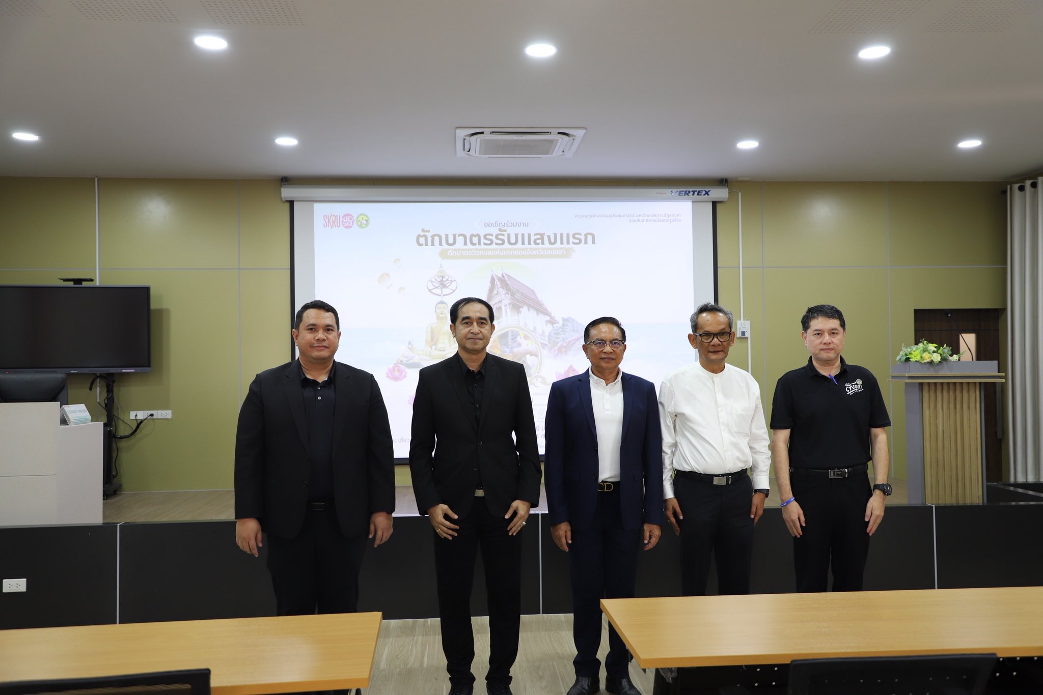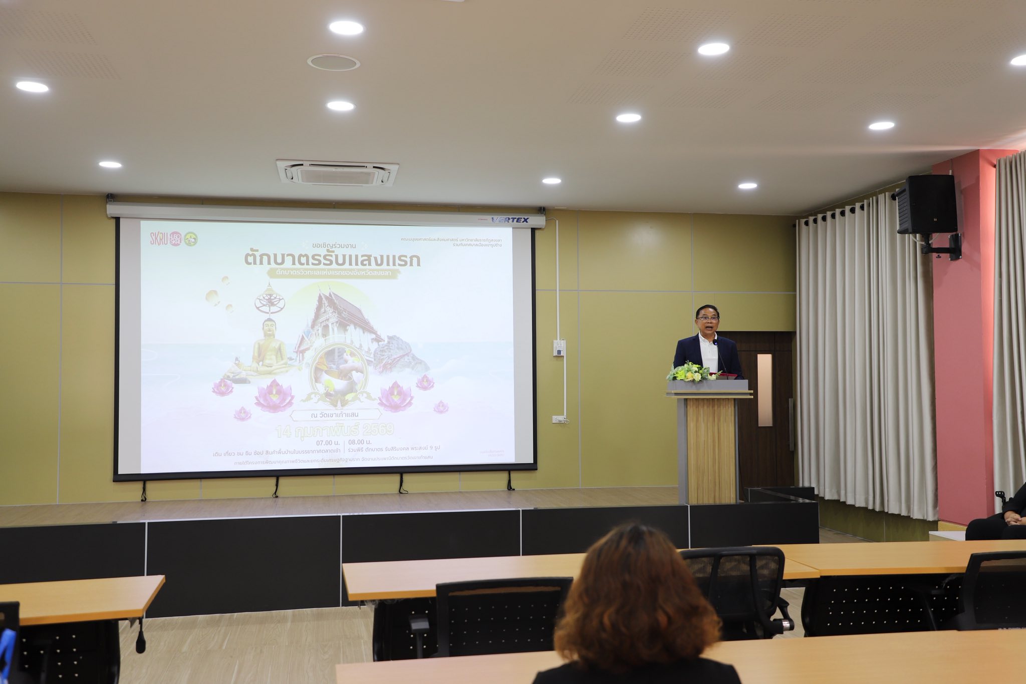 เมื่อวันที่ 4 กุมภาพันธ์ 2569 คณะมนุษยศาสตร์และสังคมศาสตร์ จัดโครงการอบรมเชิงปฏิบัติการ เรื่อง พัฒนาศักยภาพกิจกรรมท่องเที่ยวและจัดงานประเพณีตักบาตรวัดเขาเก้าแสน เพื่อเสริมสร้างองค์ความรู้และทักษะด้านการจัดการท่องเที่ยวเชิงวัฒนธรรมแก่ผู้นำชุมชน ผู้ประกอบการ และประชาชนในพื้นที่ พิธีเปิดโครงการได้รับเกียรติจาก ผู้ช่วยศาสตราจารย์พิเชษฐ์ จันทวี อธิการบดีมหาวิทยาลัยราชภัฏสงขลา เป็นประธานในพิธี โดยมี ผู้ช่วยศาสตราจารย์ ดร.รัชชพงษ์ ชัชวาลย์ คณบดีคณะมนุษยศาสตร์และสังคมศาสตร์ กล่าวรายงานถึงวัตถุประสงค์ของโครงการที่มุ่งพัฒนาศักยภาพชุมชนในการออกแบบกิจกรรมท่องเที่ยวและต่อยอดงานประเพณีท้องถิ่นอย่างมีคุณภาพ ควบคู่กับการสร้างรายได้และการอนุรักษ์อัตลักษณ์ทางวัฒนธรรม ทั้งนี้ นายนราเดช คำทัปน์ นายกเทศมนตรีเมืองเขารูปช้าง ได้ร่วมเป็นเกียรติและกล่าวต้อนรับผู้เข้าร่วมโครงการ กิจกรรมภายในโครงการประกอบด้วยการบรรยายและการฝึกปฏิบัติ (Workshop) หัวข้อ เข้าใจบรรจุภัณฑ์อาหารเพื่อสร้างแบรนด์อย่างมืออาชีพ โดย อาจารย์จิราภรณ์ ทองบุญยัง อาจารย์ศิริวรรณ ลักษณะวงศ์ และอาจารย์ธัญวรัตน์ ตันวานิช และหัวข้อ ลดขยะ ลดต้นทุน : สูตรสำเร็จการออกแบบบรรจุภัณฑ์อาหารรักษ์โลก โดย อาจารย์จริยา ทรงพระ พร้อมการฝึกปฏิบัติการกลุ่ม โดยมีวิทยากรประจำกลุ่ม ได้แก่ อาจารย์จริยา ทรงพระ และอาจารย์ฉัตรดาว ไชยหล่อ เพื่อให้ผู้เข้าร่วมสามารถนำความรู้ไปประยุกต์ใช้ในการพัฒนากิจกรรมท่องเที่ยวและบรรจุภัณฑ์อาหารให้เหมาะสมกับบริบทของชุมชน โครงการดังกล่าวได้รับความร่วมมือจากหน่วยงานท้องถิ่น ผู้นำชุมชน และเครือข่ายภาคส่วนต่าง ๆ ในการขับเคลื่อนกิจกรรม ตักบาตรรับแสงแรก ซึ่งกำหนดจัดขึ้นในวันเสาร์ที่ 14 กุมภาพันธ์ 2569 ณ วัดเขาเก้าแสน อำเภอเมืองสงขลา เพื่อยกระดับเศรษฐกิจฐานรากและเสริมสร้างภาพลักษณ์การท่องเที่ยวเชิงวัฒนธรรมของจังหวัดสงขลาให้เป็นที่รู้จักอย่างแพร่หลาย